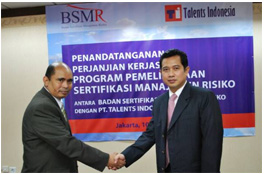 PT. Talents Indonesia bekerjasama dengan Badan Sertifikasi Manajemen Risiko (BSMR) dalam pelaksanaan seminar ataupun workshop manajemen risiko sebagai sarana pemeliharaan bagi pemegang sertifikat manajemen risiko BSMR. Penandatanganan kerjasama ini dilaksanakan pada tanggal 10 Agustus 2009 oleh Banuara A. S. Mangunsong selaku Direktur Utama PT. Talents Indonesia dengan DR. Ir. Gandung Troy S., MSI., selaku Ketua Harian BSMR.